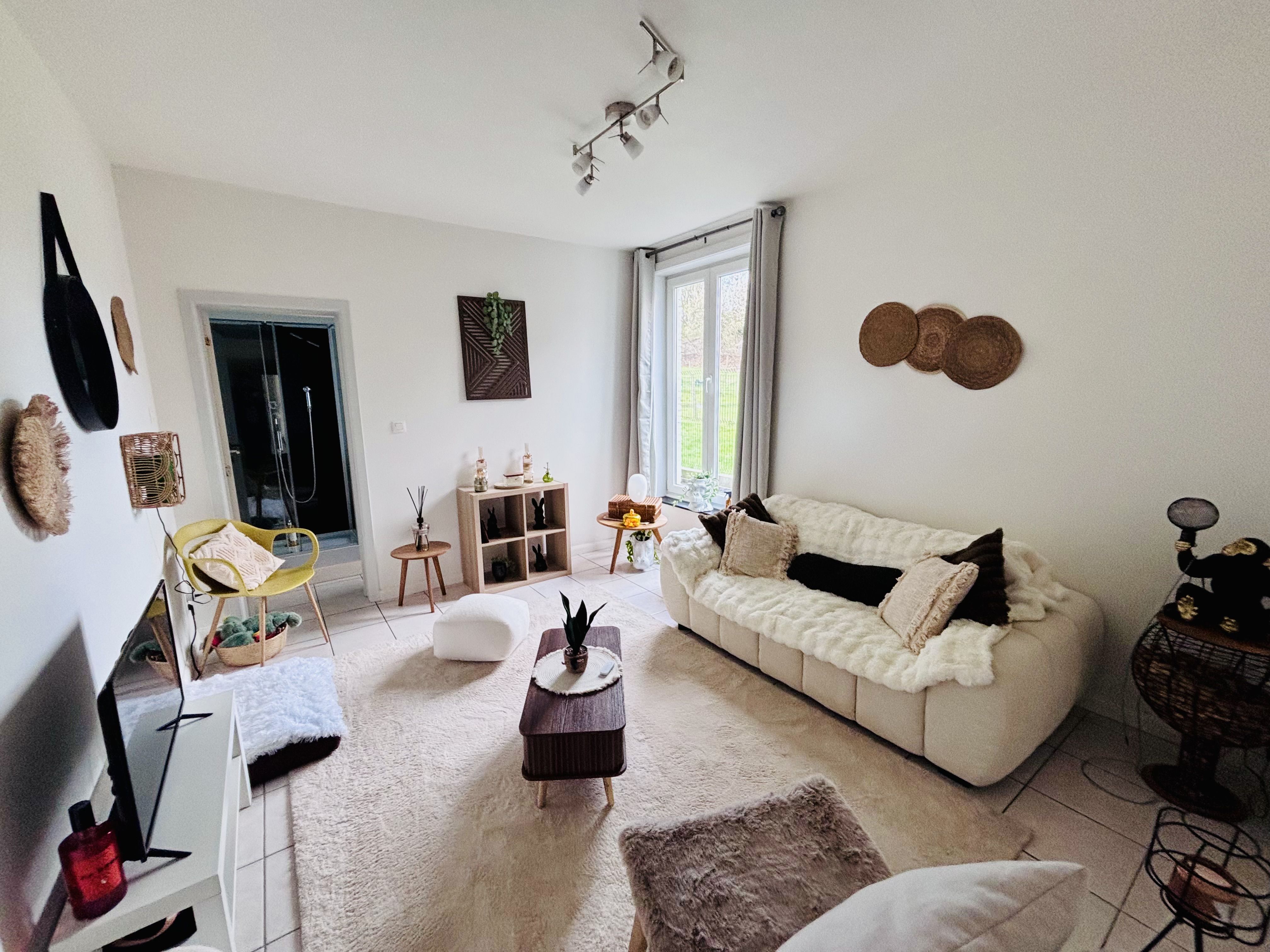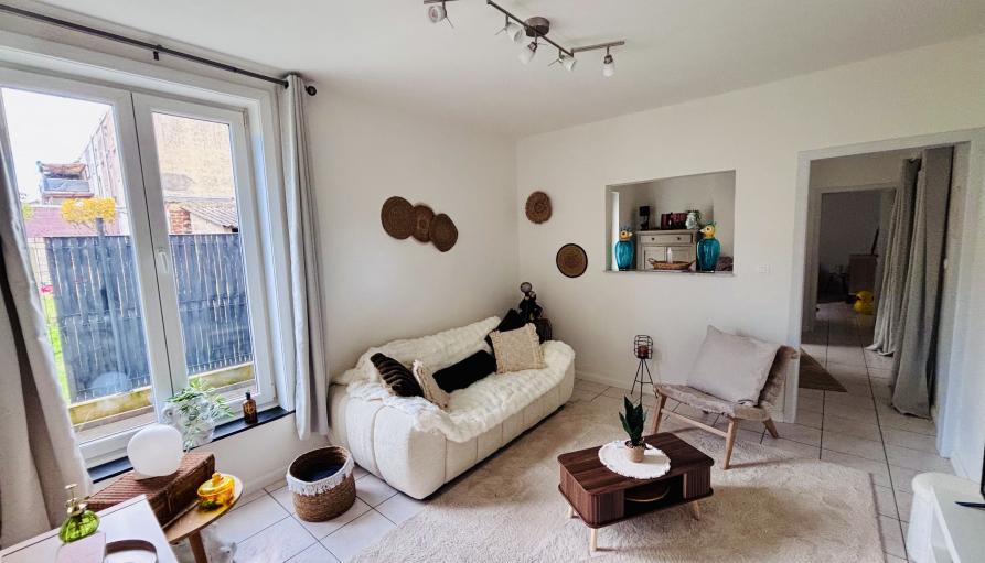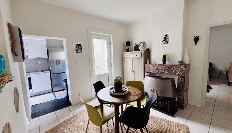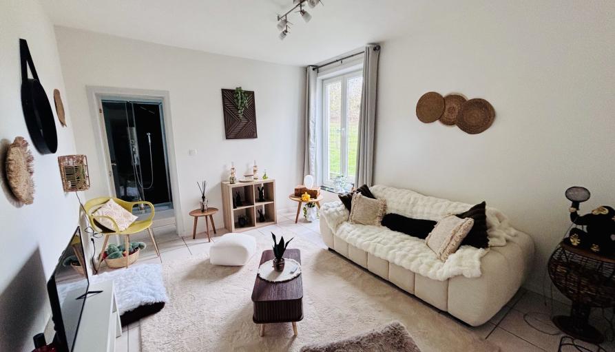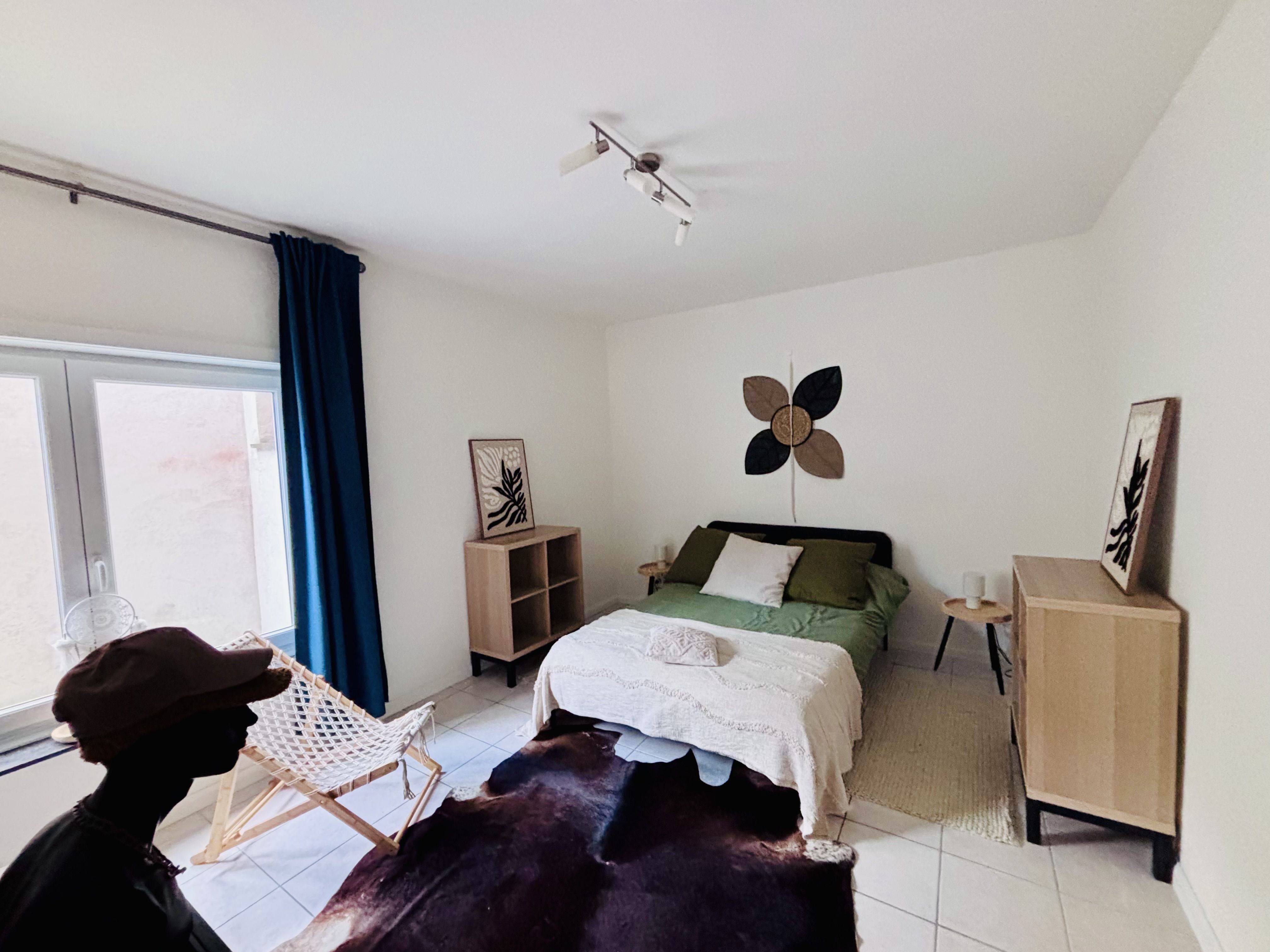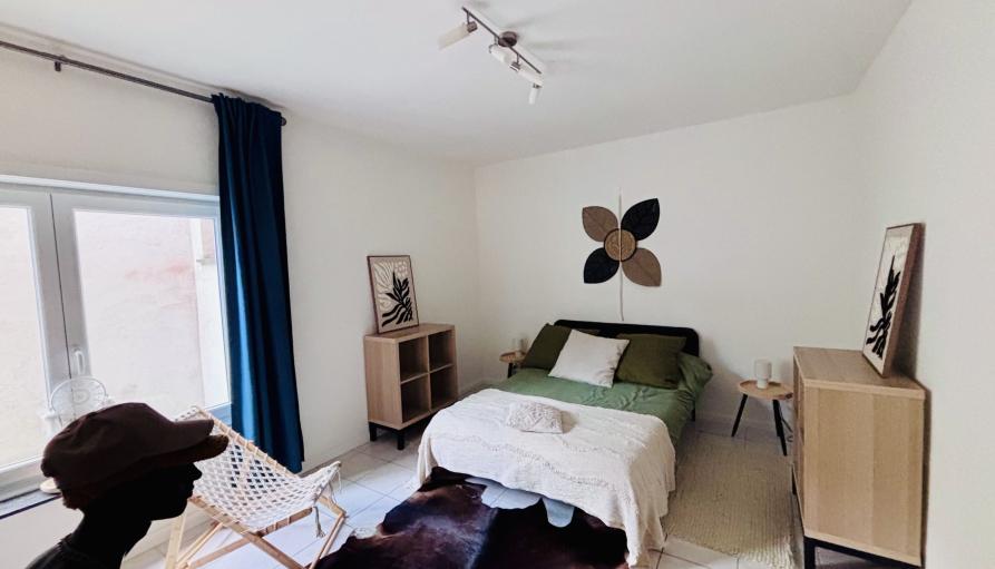 Appartement situé au rez-de-chaussée , il se compose comme suit : Hall d’entrée commun, salon /salle manger , cuisine équipée, salle de bain avec douche et WC , une chambre et 2 cours