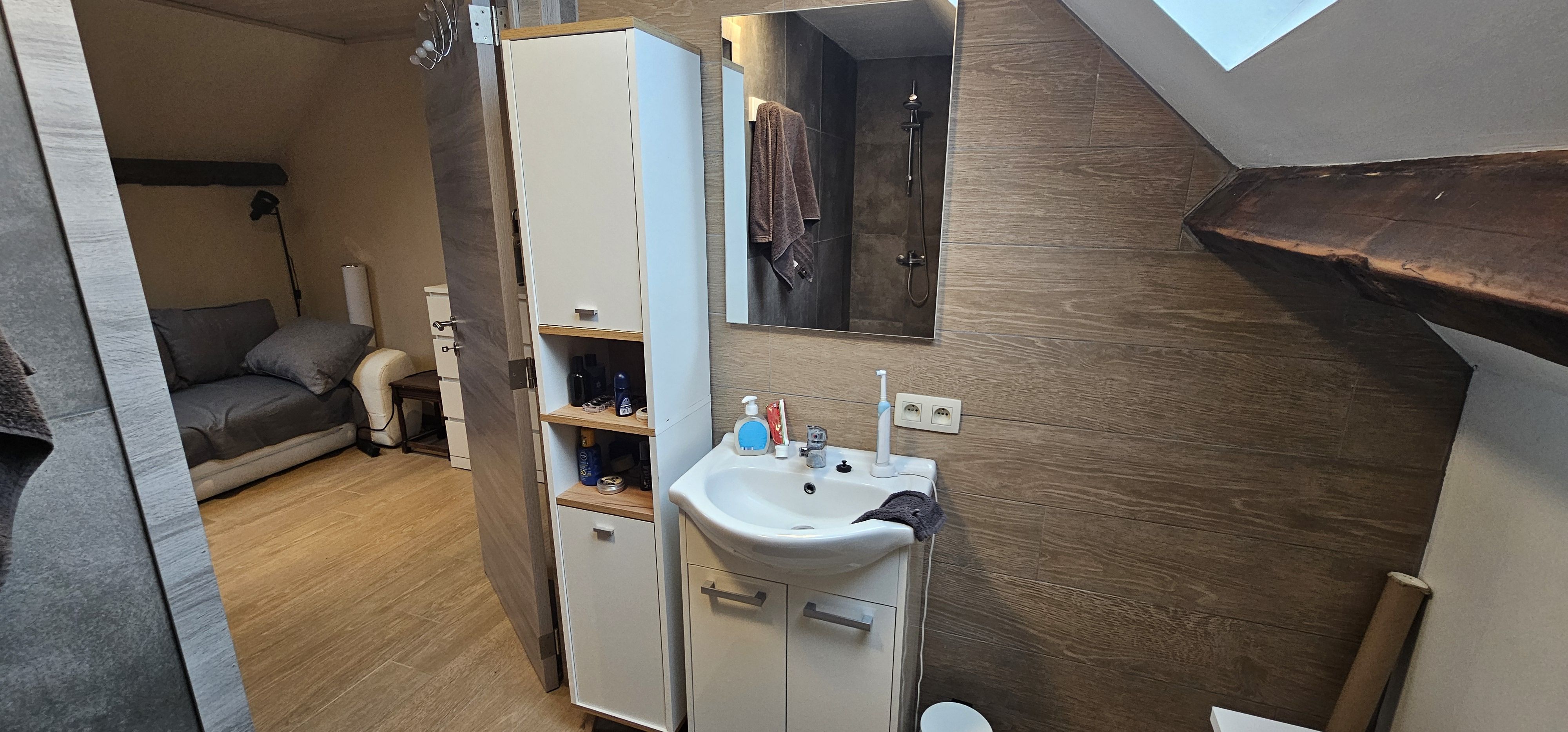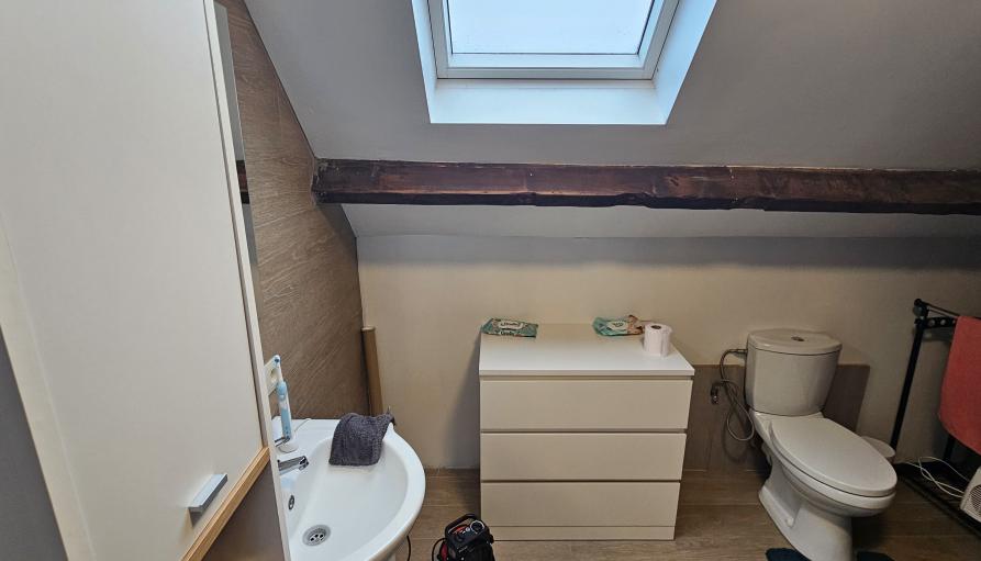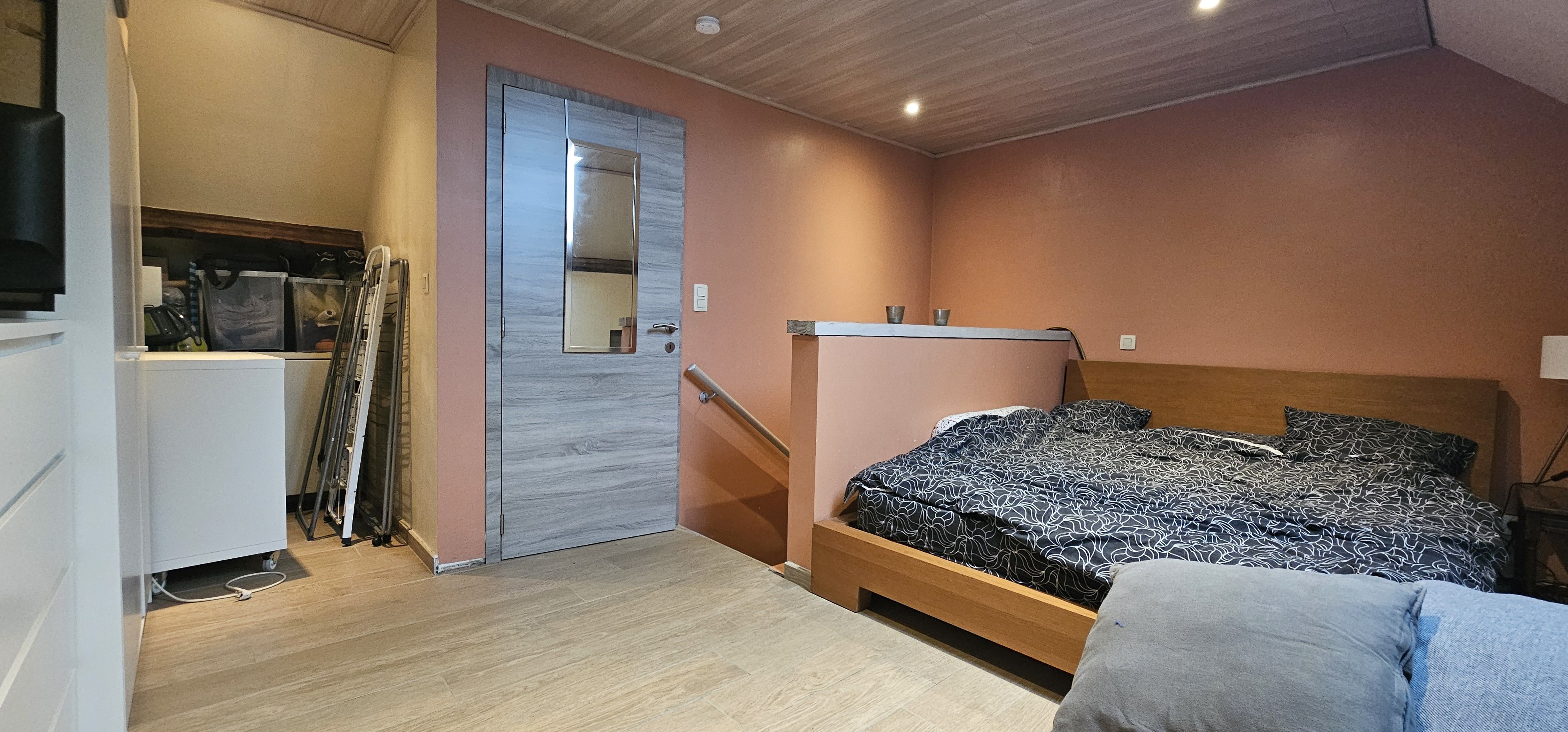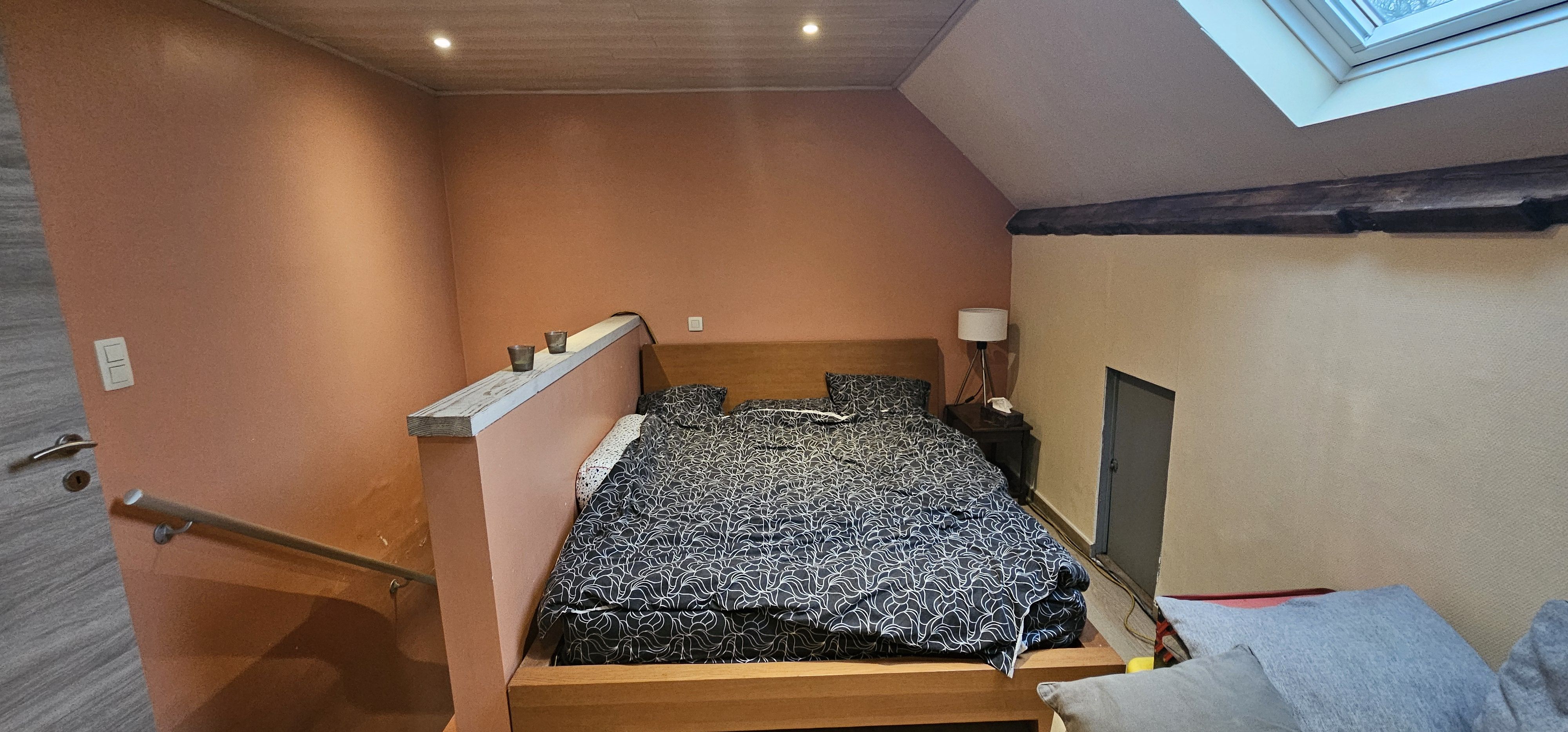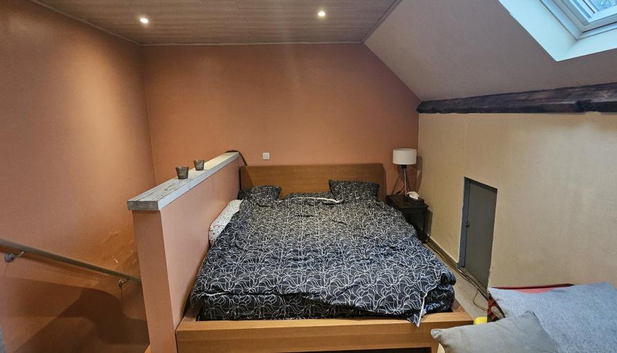 L’étage quand à lui accueil la chambre ainsi que la salle de douche avec la toilette.