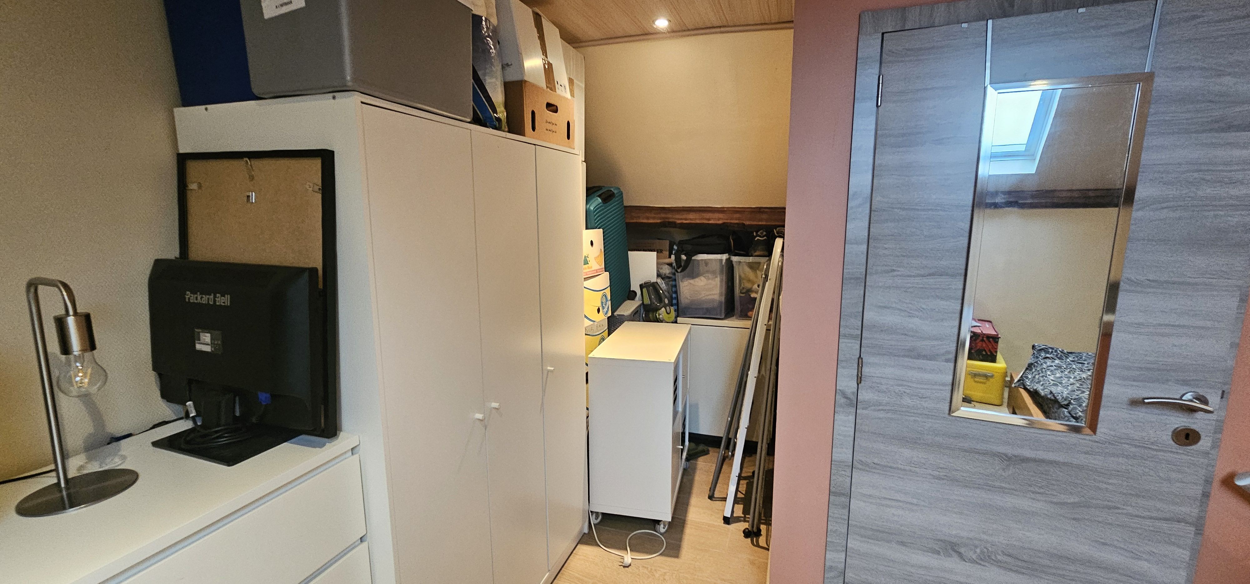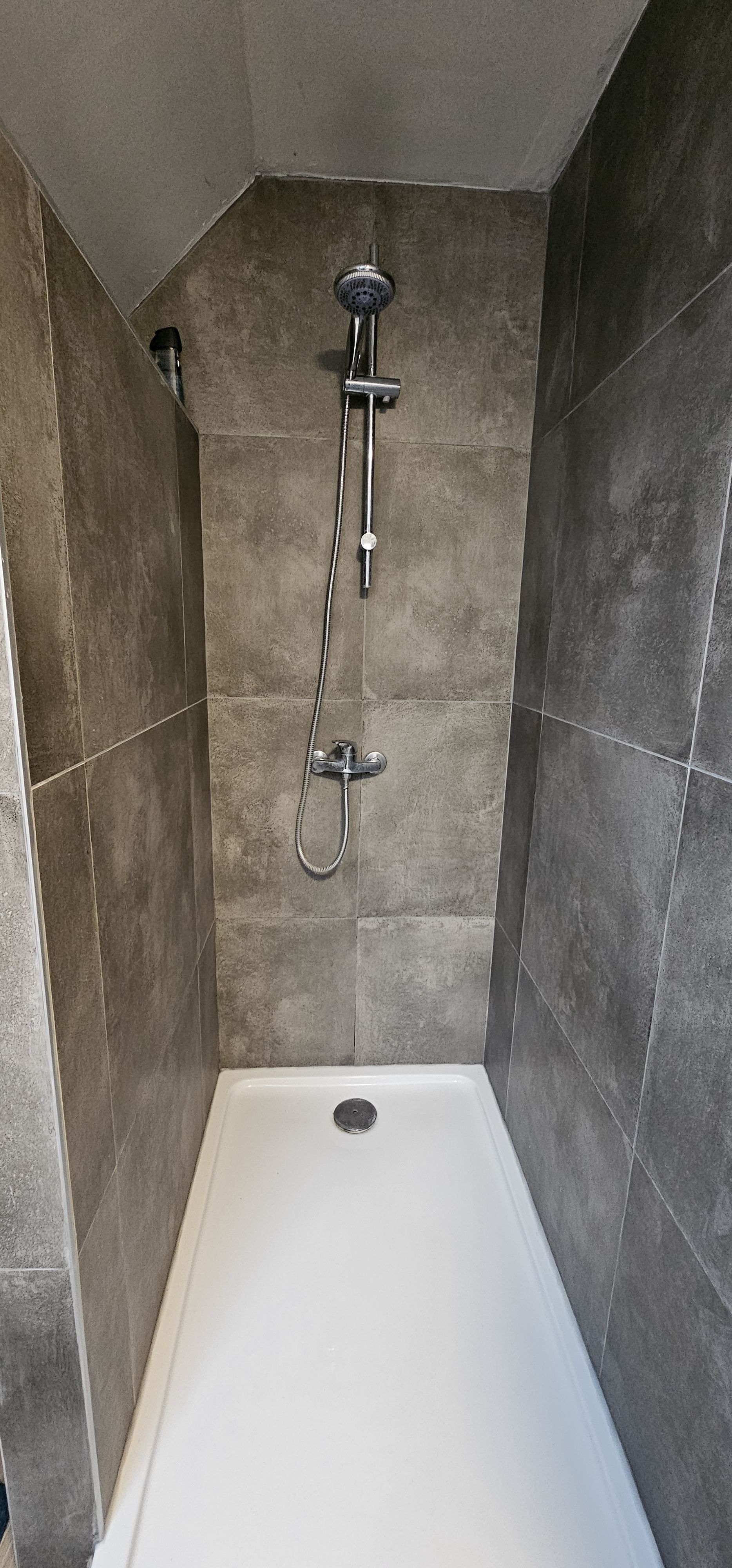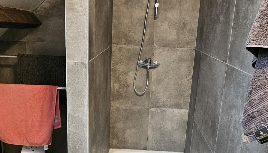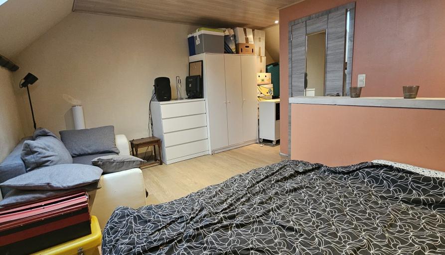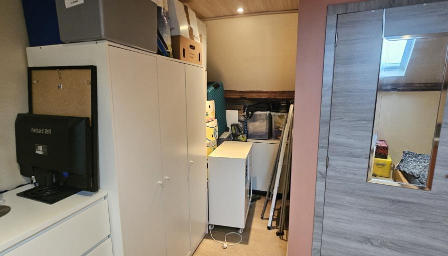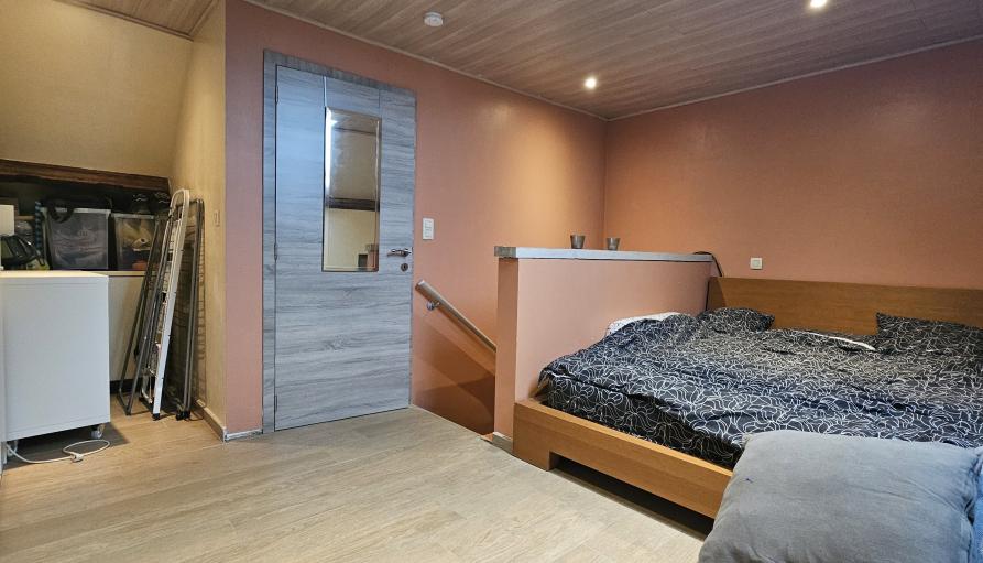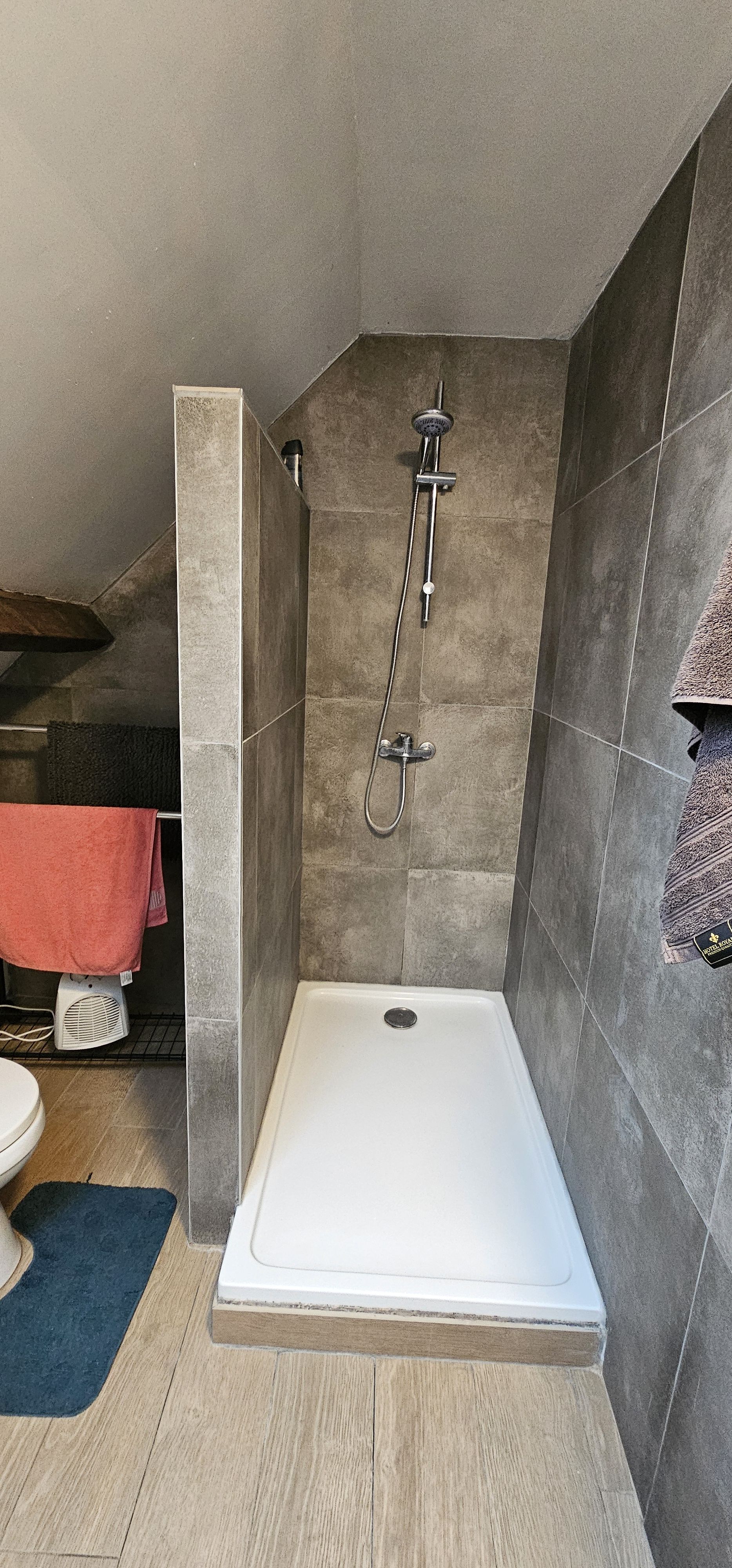 L’étage quand à lui accueil la chambre ainsi que la salle de douche avec la toilette.